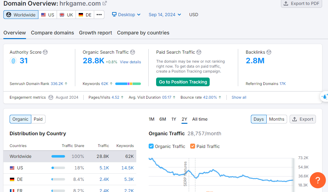 HRKGame.com experienced a 42% increase in organic traffic, reaching over 40,900 monthly visitors. This growth was primarily driven by the improved keyword rankings and better visibility in key international markets, including the US, UK, and Germany.